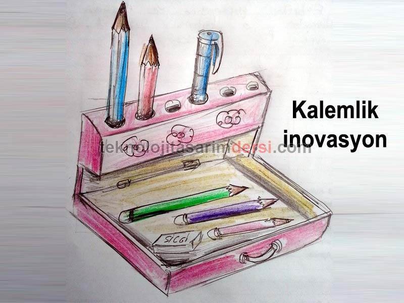 Teknoloji Tasarım Projesi – Çanta ve Masa Kalemliği : Kalemlik inovasyonunu olarak Teknoloji Tasarım Projesi için düşündüm. Kalemlik içindeki kalemler yine kalemliği takılarak dik durması ve masa üzerinden yere düşmesi engellenmiştir. Resimde kalemliğin açılmış hali çizilmiştir. Kalemlik kapatılmadan önce, dik duran kalemler çıkarılıp içine konur ve kapatılır. Normal bir kalemlik gibi olacağı içinde çantaya kolayca yerleştirebilirsiniz.