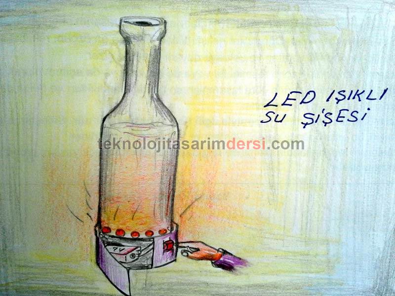Teknoloji Tasarım Projesi – Led ışıklı su şisesi : Teknoloji Tasarım Projesi için tasarladığım bu fikre ne gerek var diyebilirsiniz. Ama geceleri su içmek için hastalar çocuklar ihtiyaç duyabilmektedir. Karanlıkta su içmek için gece lambası yetersiz kalmaktadır. Işığı yakmakta sıkıntı olabilmektedir. Ama su şişesi eğerki ışıklı olursa gece lambası görevi görebileceği gibi şişeyi tahatlıkla görüp kırıp dökmeden kullanma imkanı sağlayacaktır.