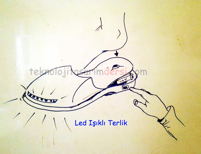 Teknoloji Tasarım Projesi Led ışıklı terlik : Proje Tasarımında fikir olarak, gece yataktan kalktığımızsa karanlıktan dolayı sıkıntı çektiğimiz aklıma çözülmesi gereken sorun olarak geldi. Terliklere led yerleştirip, parmağımız veya topuğumuzla bastığımız zaman ışık yanıyor. Gece kalktığımızda terliğimizi giydiğimizde yolumuz aydınlanmış oluyor.