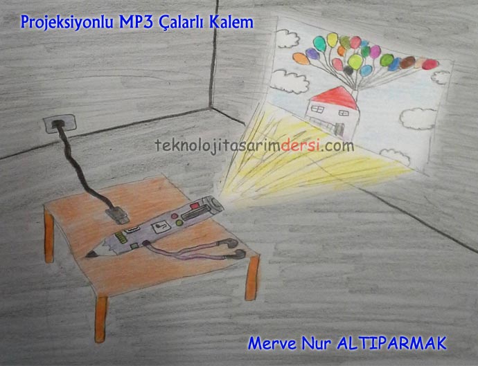 Projeksiyonlu MP3 çalarlı Kalem Teknoloji Tasarım Projesi: Bu kalemi öğrenciler için tasarladım. Öğrenciler kalemleri sürekleri yanında taşır. Aslında bir çok insan kalem taşır. Kalemde projeksiyon üzelliği olsa, mp3 çalar özelliğide çok işimize yarar diye düşünüyorum. Film veya derslerle ilgili videoları anında izleyip tekrar edebiliriz. Gerçekten çok eğlenceli olur. Teknoloji Tasarım Projesi fikrim olarak gerçekleştirme kaygısı taşımadan bulduğum bir fikir.