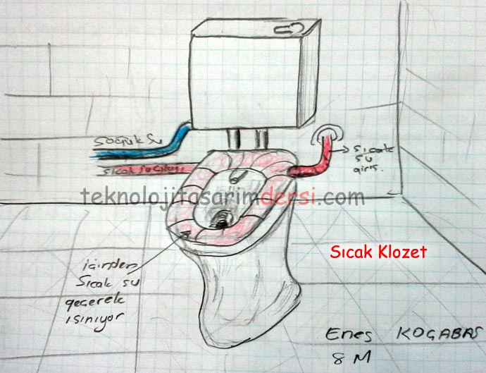 Teknoloji Tasarım Projesi – Sıcak Klozet : Klozetler bazı yerlerde kış mevsiminde çok soğuk olabilmektedir. Çocuklar ve yaşlılar ve bir çok insan için rahatsız edicidir. Bu sorunu ortadan kaldırmak için kalorifer tesisatındaki su borularının sıcak olmasından yola çıkarak fikir geliştirdim. Klozetin üst tarafının içi boş ve su giriş çıkışları olacak. Böylece ek bir enerjiye gerek kalmadan tesiattaki su klozetin oturma yerini ısıtmış olacaktır. Bunun için özel tasarlanmış klozet kapağı icat edilebilir ve tüm klozetlere tesisatçı yardımı ile uygulanabilir.